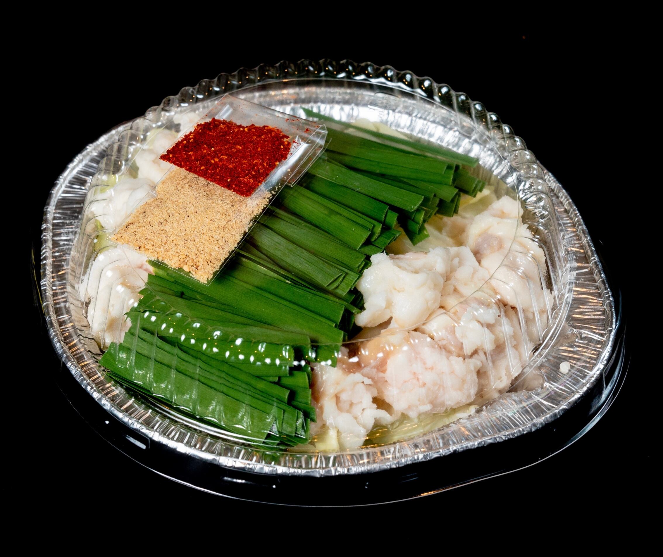 牛もつ(国産牛の小腸のみを使用) 、キャベツ、ニラ、ごぼう、鍋だし、ちゃんぽん麺200g×1玉、薬味(唐辛子・ゴマ) 約620g